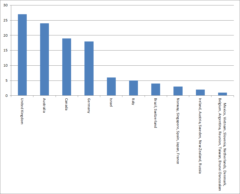 Countries Contributing - All in all there were 420 contributors, 33% of which were international. Of those, UK, Australia, Canada and Germany were the most highly represented with a sprinkling of other countries throughout Asia and Europe.