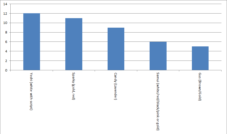 Unicorn Choices - Of the 43 unicorns we've heard aback about, there was a clear preference for the two unicorns featured in the video and on the campaign (Sparky and Yoshi) , with Candy running a close third. The plain unicorn (Samui) was also popular, with the white and black as the chosen colors. Gus (who just happens to be my favorite) didn't fair as well but still had a good standing.